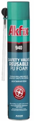 Akfix 940 é uma espuma de poliuretano monocomponente, operada manualmente com uma cânula e equipada com uma válvula de segurança especial que nunca bloqueia e permite que a lata seja reutilizada.