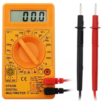 O Multímetro digital mede Tensão Contínua, Tensão Alternada, Corrente Contínua, Resistência, Continuidade, Transistor, Diodos e saída de onda quadrada de 1,5V 55Hz